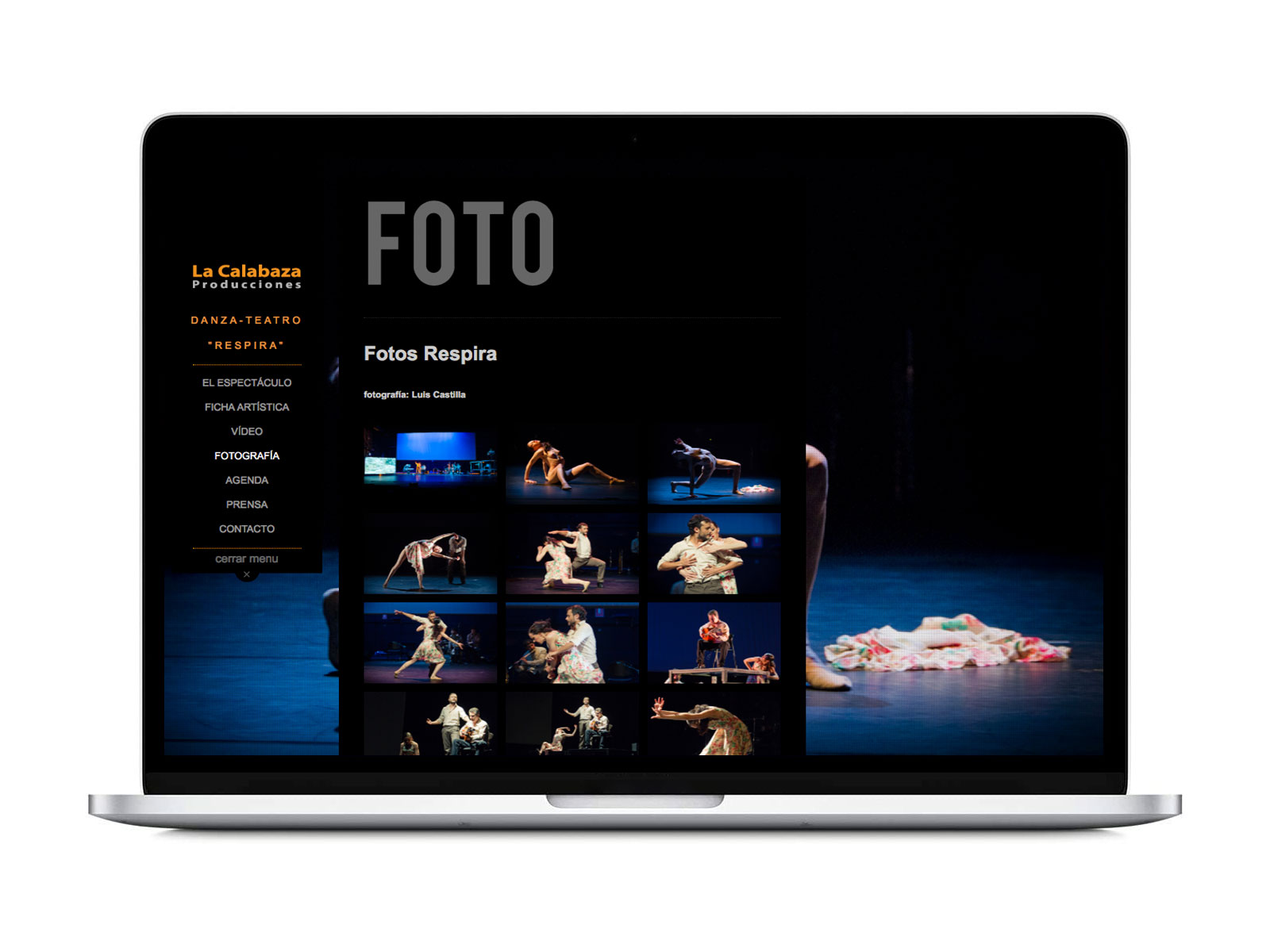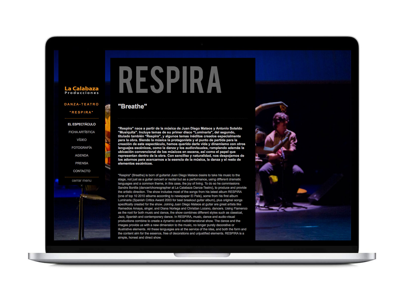 Diseño de página web para el espectáculo de Danza contemporánea y Flamenco “RESPIRA” de la Calabaza Producciones, con Remedios Amaya y Juan Diego Mateos bajo la dirección de Sandra Bonilla.